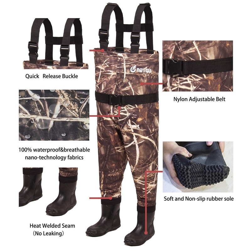 - Adjustable shoulder straps and belts with quick release buckle.Allow you to pull the waders on and off super easily due to the simple design