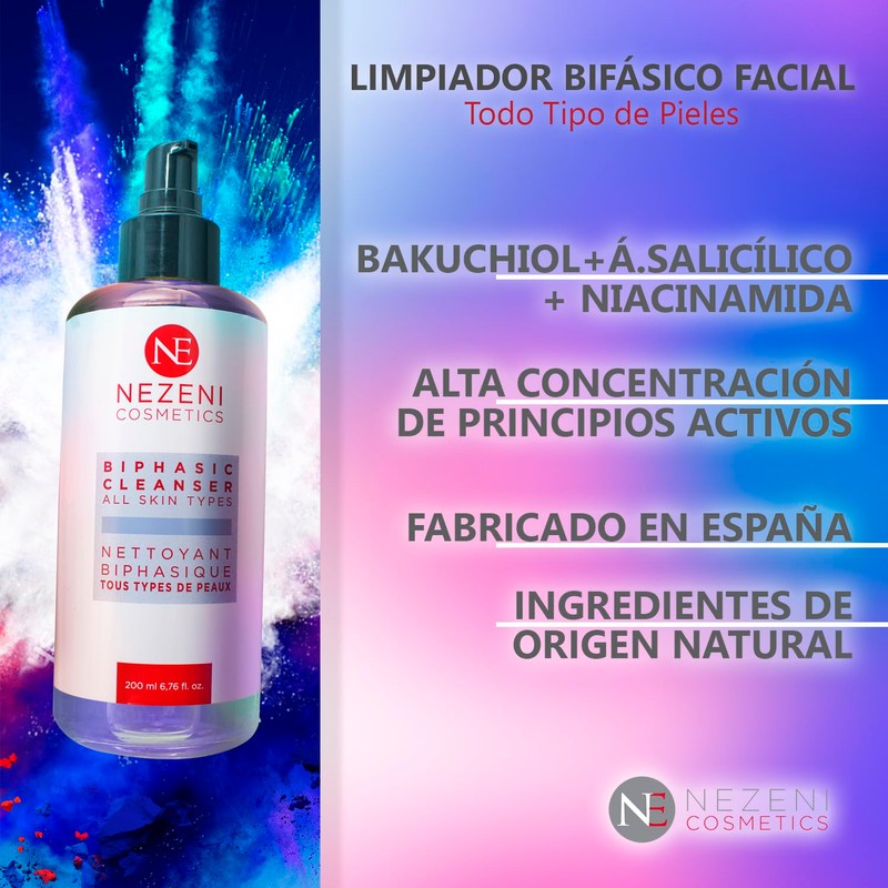 At Nezeni Cosmetics we have developed two-phase facial cleanser/remover that has a two-phase formula that removes all types of makeup on the face and eyes in a single gesture, even the long-lasting and water resistant. A very pleasant texture that leaves an incredible feeling of cleanliness, freshness and comfort on the skin. All this together with an explosive blend of active ingredients such as vegetable retinol, salicylic acid, niacinamide and vitamin C among others. Its composition contains no alcohol to ensure complete tolerance in the eye area. Here we show you a summary of the 9 active ingredients: Bakuchiol: Powerful antioxidant, retinol like, anti-inflammatory action regulates sebum for oily and acne-like skin. Antimicrobial controls the microbial flora of the skin. Salicylic acid - is an acid with keratolytic function. In addition, it is an effective remedy for acne skin as it reduces swelling, reduces redness and opens clogged pores. Niacinamide: helps keep skin hydrated, reduces skin sensitivity, corrects imperfections and improves skin elasticity. Glycerin - Moisturizing, smoothing and smoothing the skin. Wheat germ oil: nourishes, moisturises and softens the skin. It is a powerful antioxidant because of its high content of vitamin E. Hydrogenated ethylhexyl olivate: moisturising effect thanks to its own fatty acids of the skin, nourishes and makes it more flexible. Ascorbyl Palmitate (Vit C): antioxidant, free radicals slows down aging processes. Betaine: It mainly acts as a moisturizer and anti-irritant and also reduces the depth of wrinkles. Hydrogenated Olive Oil Unsaponifable: It works by softening the skin and improves dry or rough tissue.