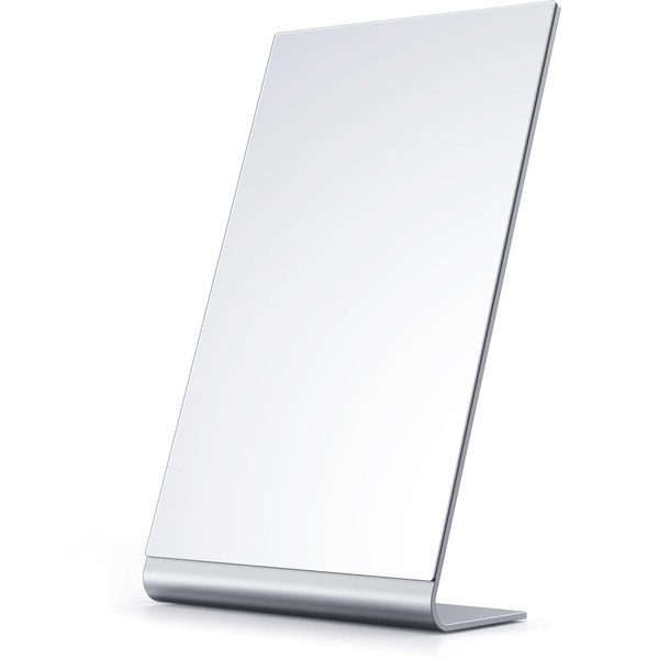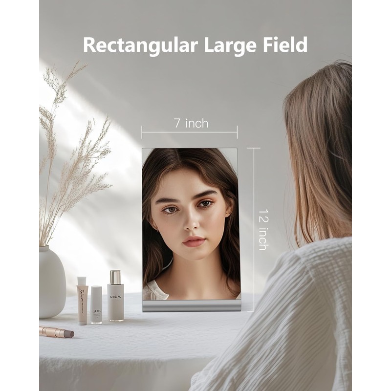 - Silver makeup mirror, rectangular large field design, 12” long and 7” wide, enough to clearly observe every detail of your upper body. No magnification, no distortion.