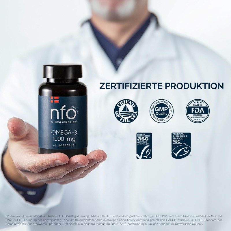 - ZERTIFIZIERTES PRODUKT NACH HOHEN STANDARDS: Alle unsere Produkte sind von Organisationen der Lebensmittelbranche für Kategorien wie Fischöl, Omega-3, Vitamine und Mineralstoffe zertifiziert. Die wichtigsten Zertifizierungen: 1. FDA – Registriert bei der U.S. Food and Drug Administration; 2. FOS DNV Produktzertifikat – Ausgestellt von Friend of the Sea; 3. GMP – Erteilt von der Norwegischen Lebensmittelaufsichtsbehörde (Mattilsynet) gemäß den HACCP-Grundsätzen; 4. MSC-Lieferkettenstandard – Zertifiziert vom Marine Stewardship Council für nachhaltig gefangene Meeresfrüchte; 5. ASC – Ausgestellt vom Aquaculture Stewardship Council; 6. Halal-Zertifikat der JUHF für Rindergelatine