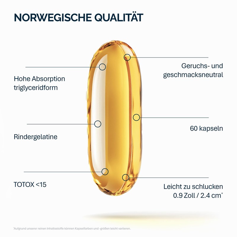 - HOHES SICHERHEITS- UND EFFEKTIVITÄTSPROFIL: Frisches Fischöl: Niedriger Oxidationsindex: TOTOX <15! Der Gesamtoxidationsindex wurde von der EU-Verordnung auf den maximal zulässigen Wert von 26 festgelegt. Frisch gefangener Fisch hat einen TOTOX-Wert <4. Werte über dem Niveau von TOTOX 26 weisen auf eine aktive Oxidation des Omega-3-Produkts und das Auftreten einer großen Menge freier Radikale darin hin, die Karzinogene sind; Enthält keine chemisch synthetisierten Substanzen; Minimale Kontraindikationen; Hohe Bioverfügbarkeit – EPA und DHA mit Triglyceriden und Vitamin E; Hoher täglicher Omega-3-Gehalt in nur einer Tagesdosis (2 Kapseln)
