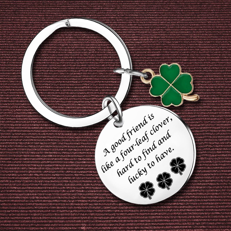 - This keyring engraved with"A good friend is like a four-leaf clover, hard to find and lucky to have."A sweet present for friends that will be cherished and can be carried around every day. Celebrate the unique bond between you and your best friend with this keyring.