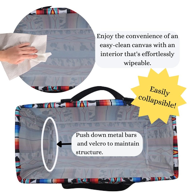 - ② Constructed with water resistant canvas material. Push down metal bars and velcro to maintain the shape of the bag. Open basket style