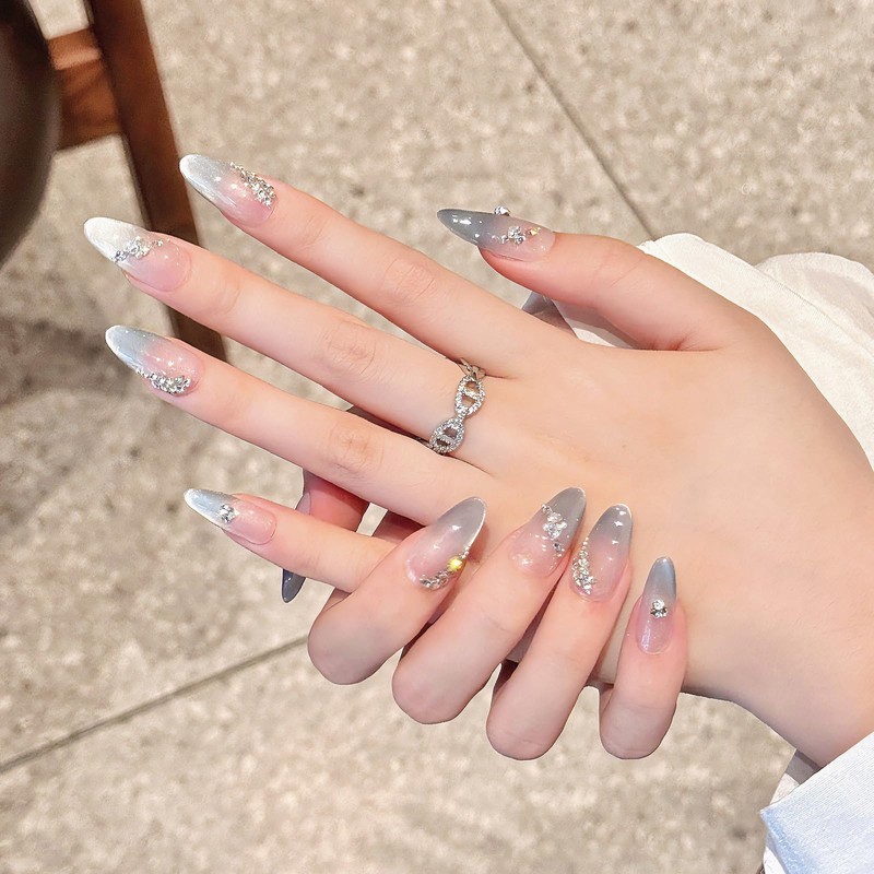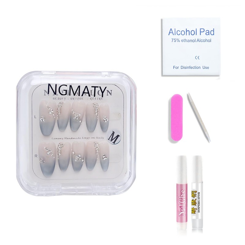 - HIGH QUALITY & ADVANCED DESIGN: Enjoy a salon quality experience with our NGMATY Nail Press Ons sets.Our midium gray blue gradient handmade almond shaped press nail art features a gradient cat eye design, combined with a handmade 3D rhinestone design to present a unique beauty and add color to your look. In addition, our most popular almond style ensures that your nails look more elegant and beautiful while protecting their health.