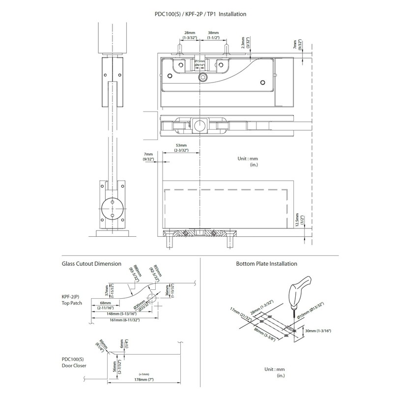 - Non hold open model. Suitable for a glass door 5/16-1/2inch thick, 30-39.3inch wide and a maximum weight of 220lbs.