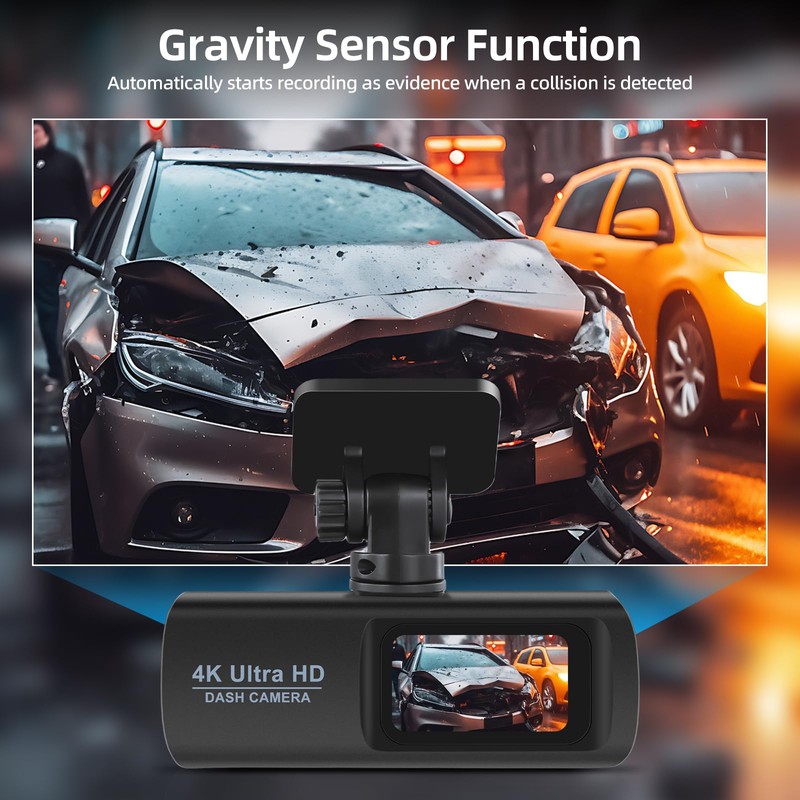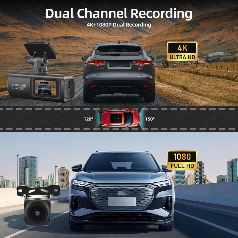 - “Grabación Dual HD”: Nuestra dash cam cuenta con una cámara frontal 4K y una cámara trasera 1080P, lo que le permite capturar cada detalle de su experiencia de conducción desde todos los ángulos. Tanto si se trata de paisajes impresionantes como de sucesos inesperados, dispondrá de grabaciones nítidas para garantizar su seguridad al volante