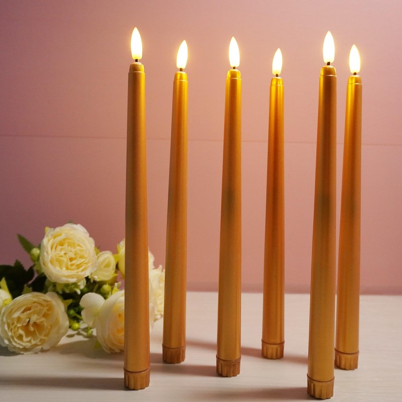 - Package includes: set of 12 gold flameless taper candles, 11 inch height x 0.86 inch wide, 1 remote controller, box packaged.