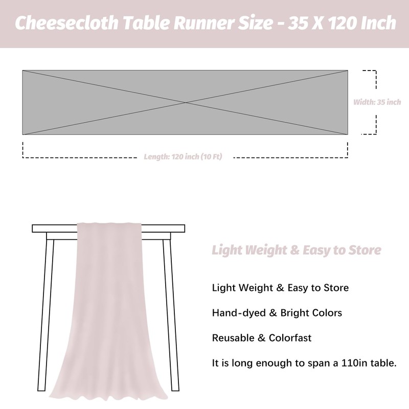 SUITABLE SIZE - The cheesecloth table runner size is 35 x 120 Inch,light weight and easy to store. It is long enough to span a larger table. Tablecloths are an ideal event decoration when you are holding a large event. Use the table runners as a colorful centerpiece with some candles and flowers, the beautiful & elegant design will immediately enhance your dining environment.