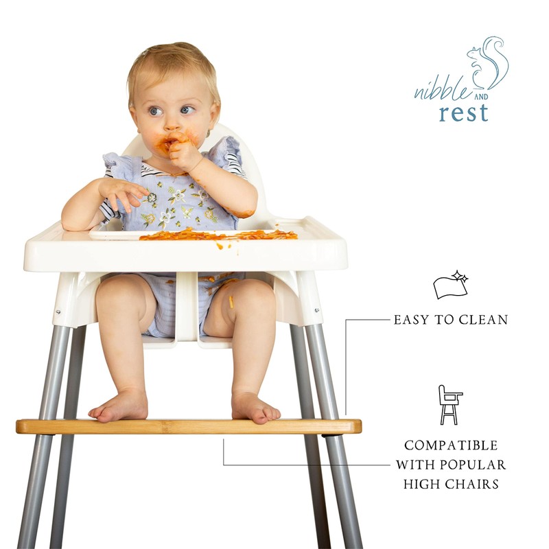 This very popular height adjustable footrest is designed to perfectly fit the IKEA Antilop highchair. This footrest will help to promote correct posture and stability during mealtimes and allow children to increase their motor skills and improve their levels of concentration, which in turn encourages a better feeding and learning experience. How does it work: The bamboo footrest is installed by o-rings underneath and above (if required) the bamboo footrest board. The o-rings can be installed at various heights on the chair to adjust the footrest to perfectly match where your child needs it to be. Our Nibble and Rest wooden footrest comes with thick o-rings. We provide full instructions and after care support, invest in a footrest that has been tested by thousands of mums and stays up! Benefits: Provides security and comfort for your infant while sitting Adjustable height to support your child as they grow from baby to toddler Allows child to sit upright with stability Allows child's feet to be positioned 90 degrees from their legs Encourages improved concentration on tasks while in high chair (e.g eating & dining) Allows for better hand to mouth coordination Quick installation (no tools required) Safety Warning: Highchair footrests are important as they help provide proper posture and comfort for your child. However, footrests may potentially make it easier for your child to push themselves up and out of their seat. Therefore, the footrest must always be used with the highchairs own safety harness fastened tight. You must always supervise your child in the highchair and DO NOT leave them unattended. Lastly, please keep unused o-rings and suction locs out of reach of children. These items are not toys and are a choking hazard.