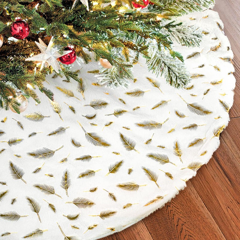 - Christmas Decorations for Tree: This white and gold tree skirt matches the festival atmosphere. Golden feathers dotted with white tree skirt, like the leaves from the Christmas tree fell on the tree skirt. It is very suitable to create a 'White Christmas' theme. The tree skirt is durable, after Christmas, you can use it as a home carpet, or fold it up to store use in next year.