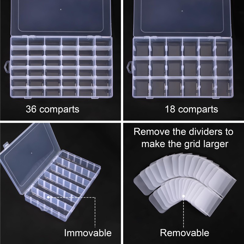 - Package and size: the compartment organiser box comes in a two-piece container with removable dividers, which can create 36 compartments after full setup. The size of the clear box is 27.4 x 17.5 x 4.4 cm (10.8 x 6.9 x 1.7 inches), the dimensions of each individual compartment are 4.3 x 2.7 cm (1.7 x 1.1 inches).