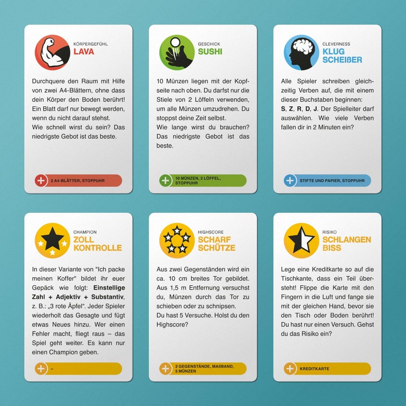 - Für 4 bis 8 Spieler, 60-90 Minuten. 54 Minispiele in Spielesammlung enthalten, zusätzliche Challenges kostenlos zum herunterladen. Zum Spielen werden einige einfache Haushaltsgegenstände wie Münzen oder Löffel benötigt.