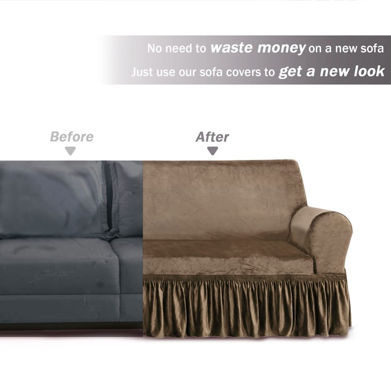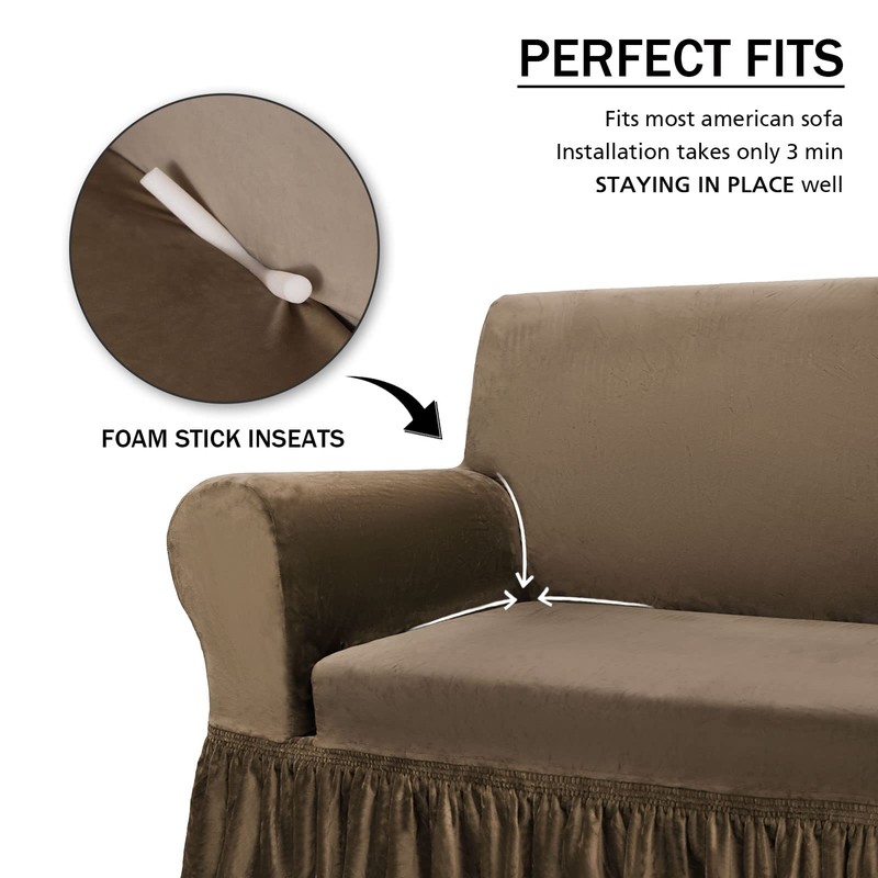 - NICE FITTING——This stretchable brown sofa cover fits most home furniture sofas. It is easy to fit various kinds of couches (Pls measure the size in advance according to the dimension drawings on the picture.) .Anti-slip foam roller prevents the couch covers for sofa slipping off.Elastic cord can easily adjust the position of the sofa slipcovers
