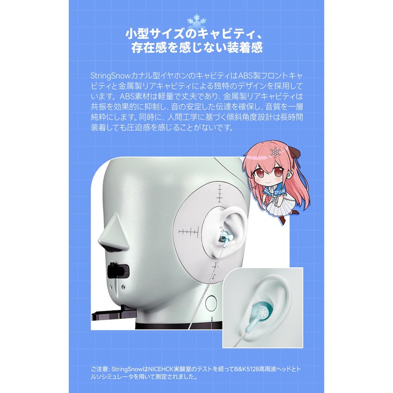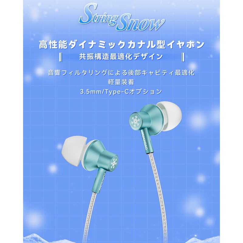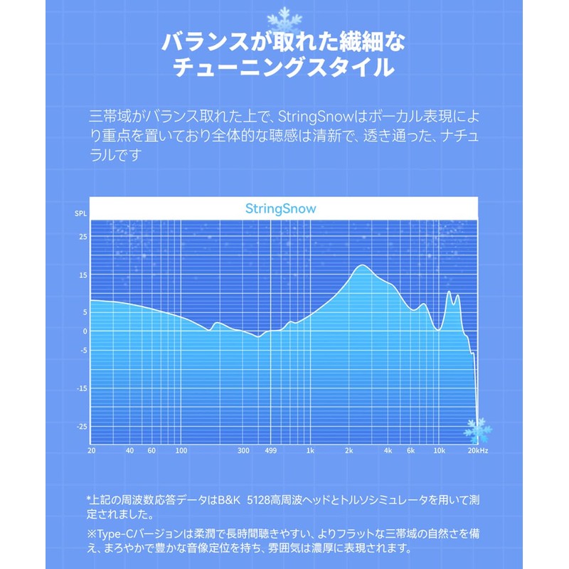- (0.4 inch (10 mm) PEEK composite PU + LCP dome diaphragm) StringSnow in-ear earphones are 1DD in-ear earphones and are equipped with a dynamic driver with excellent performance of 0.4 inch (10 mm) PEEK composite PU+LCP dome diaphragm