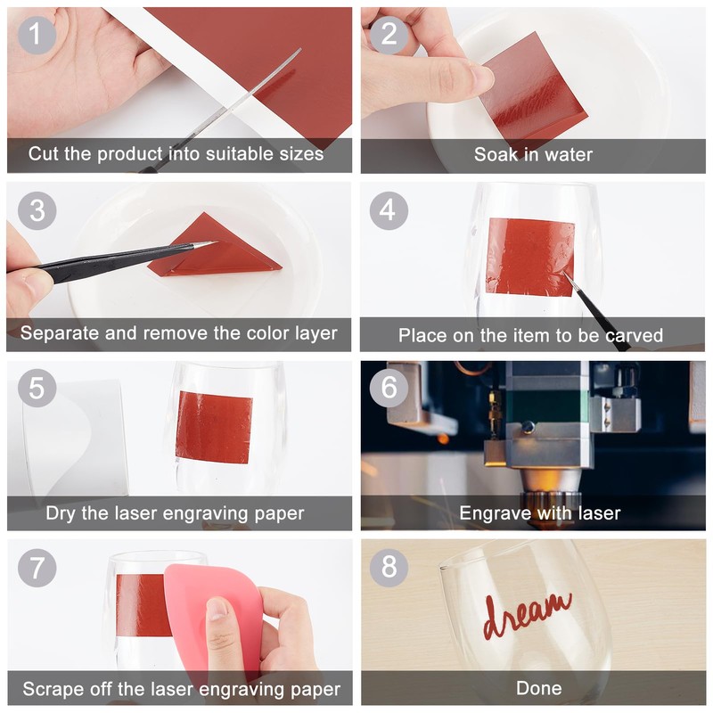 • STEPS TO USE: Cut the laser engraving paper to the right size, followed by putting it into water to soak for 1-2 minutes. Stick the laser making paper on the item to be engraved (black side up) and dry it with a paper towel or use a hair dryer to dry the residual water on the laser color paper. Use the laser engraving machine to engrave and finally scrape off the excess laser color paper