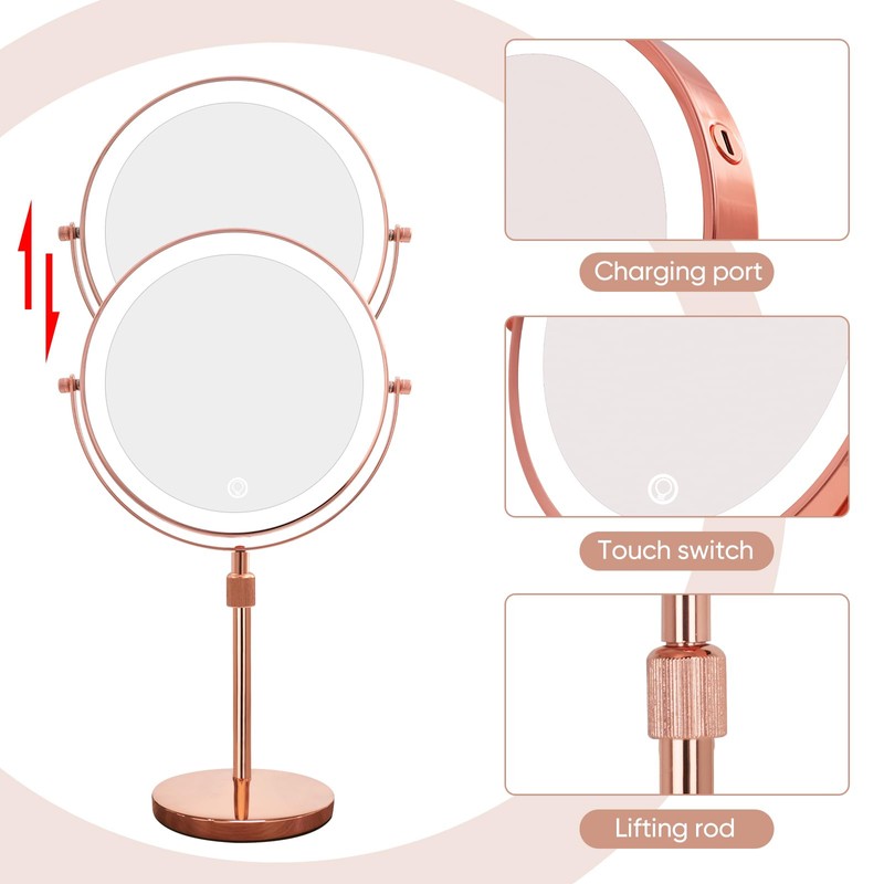 Nicesail LED Make up Mirror with Lighting, Magnifying Mirror with 3 Color Dimmable Lights, Height Adjustable Stand up 360°Rotation Double Sided, Rose Gold (8 Inch, 10X)