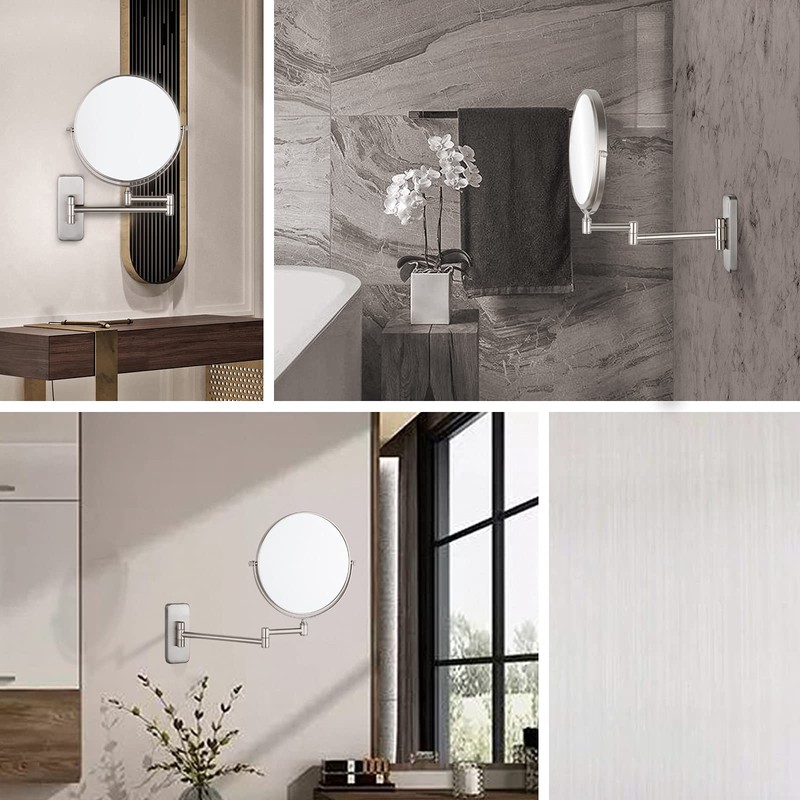 - 【Free rotation wall makeup mirror】①Not have to bend anymore. This foldaway makeup mirror for wall with 11.5 inch extendable arm, could be pulled out in front of your face to get a close up look, freely adjust and easy to fix the mirror at any angle as your need, offer a wide-angle view. ②After use, folds away nicely easily to save space. Meet your demands of maintaining a clean bathroom and avoid jam.