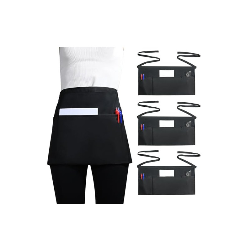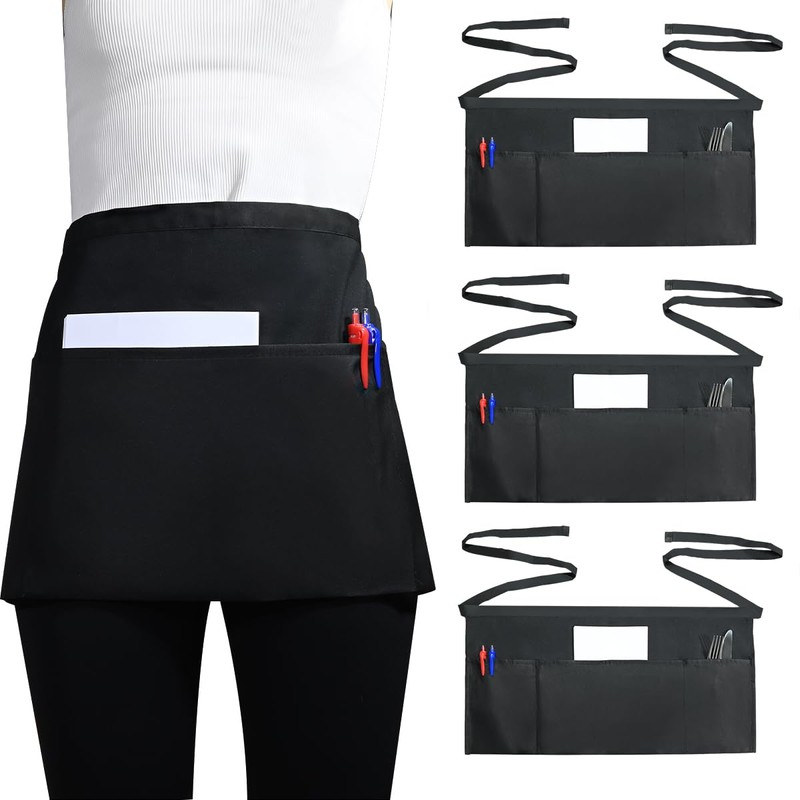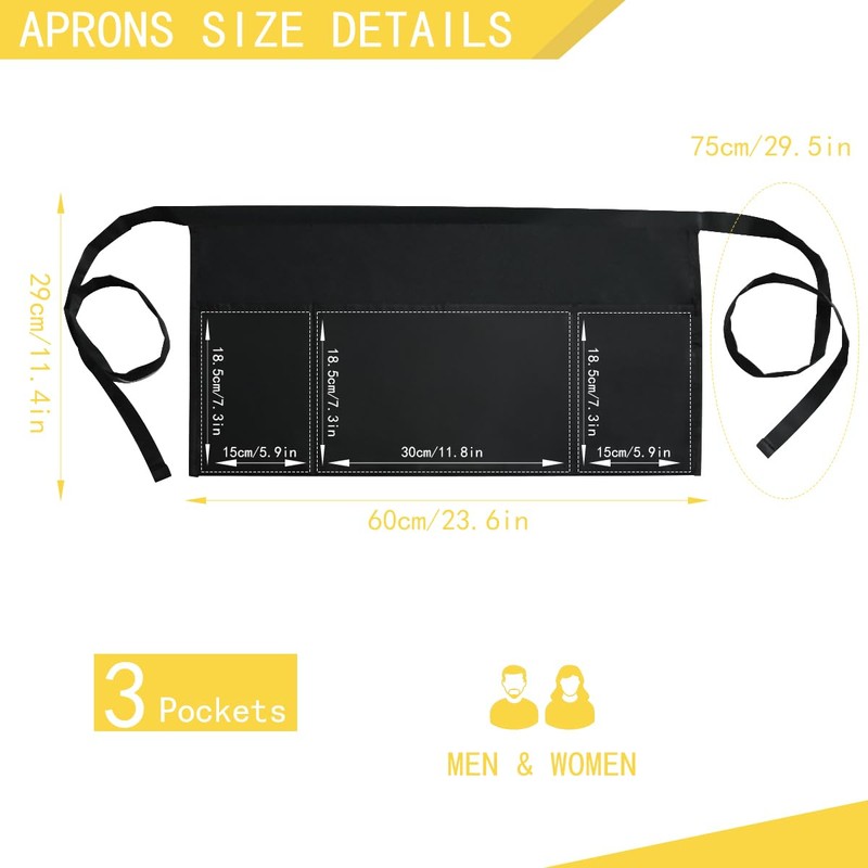 NiceTatertay Server Waitress Waist Apron 3-Pocket Half Aprons 2 Pack Black Short Aprons for Waiters Servers