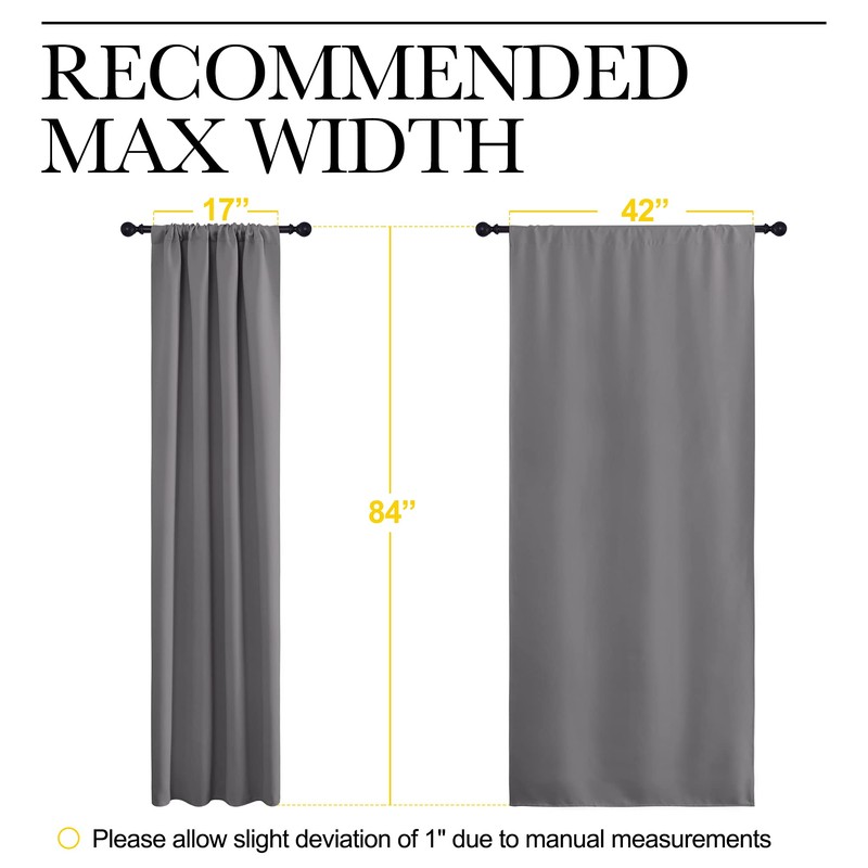- ELEGANT DESIGN: 2 panels per package. Each Blackout Curtain Panel measures 42 inches wide x 84 inches long. Super heavy and soft Blackout Curtain Panels can block 85%-99% light and UV rays. Thread trimmed and wrinkle-free, both sides are the same color.