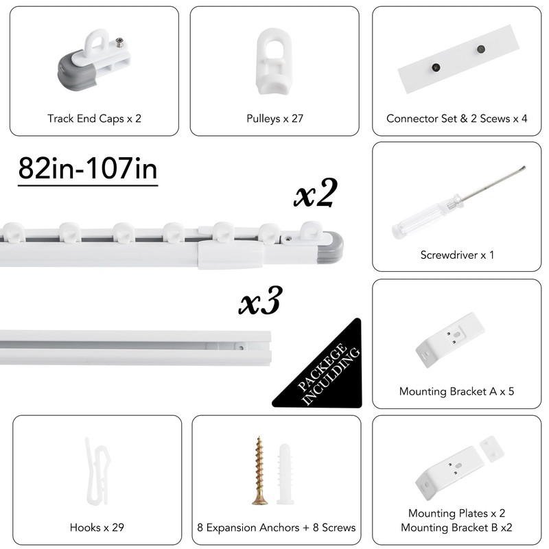 - Adjustable Track & Full Coverage: Included 1 panel (100"W x 84"L) & extendable white track (86–107"). The rust-proof track mounts to ceilings or walls, adapting to sliding doors, room dividers, or large windows. Ideal for homes, hospitals, or offices needing flexible privacy solutions.
