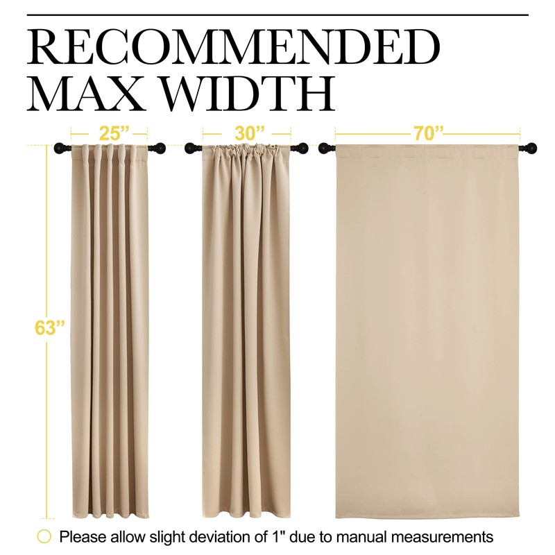 - READY-MADE: Set includes 2 blackout curtain panels, each panel measuring 70" wide x 63" length. Quality fabric without liner feels soft and heavy. Thread trimmed and wrinkle-free, both sides are the same color.