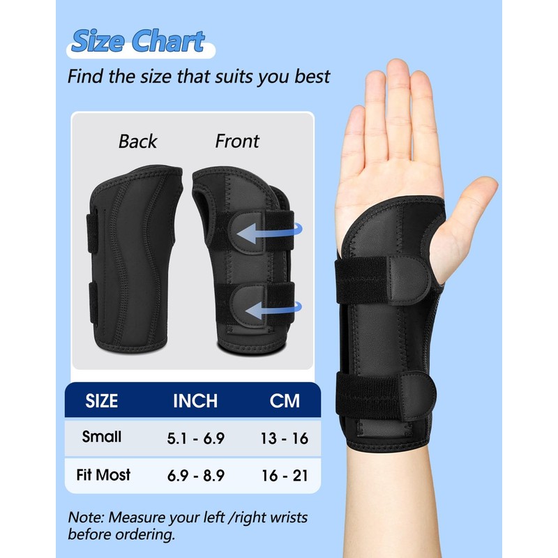 • 【Size Guide】S/M (5.1 - 6.9 inches) and L/XL (6.9 - 8.9 inches). Before purchasing carpal tunnel splint, please measure the circumference of your left/right WRIST and select the appropriate size based on the size chart. Please note that when you first open the product packaging, there might be a slight neoprene smell. If you're sensitive to odors, we recommend airing out the product before use.