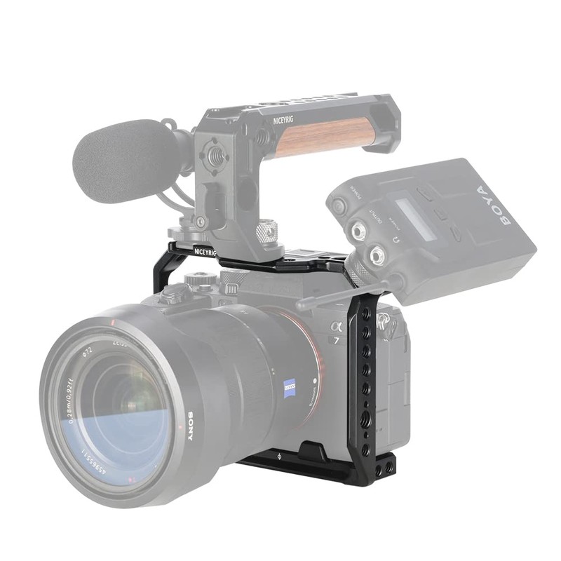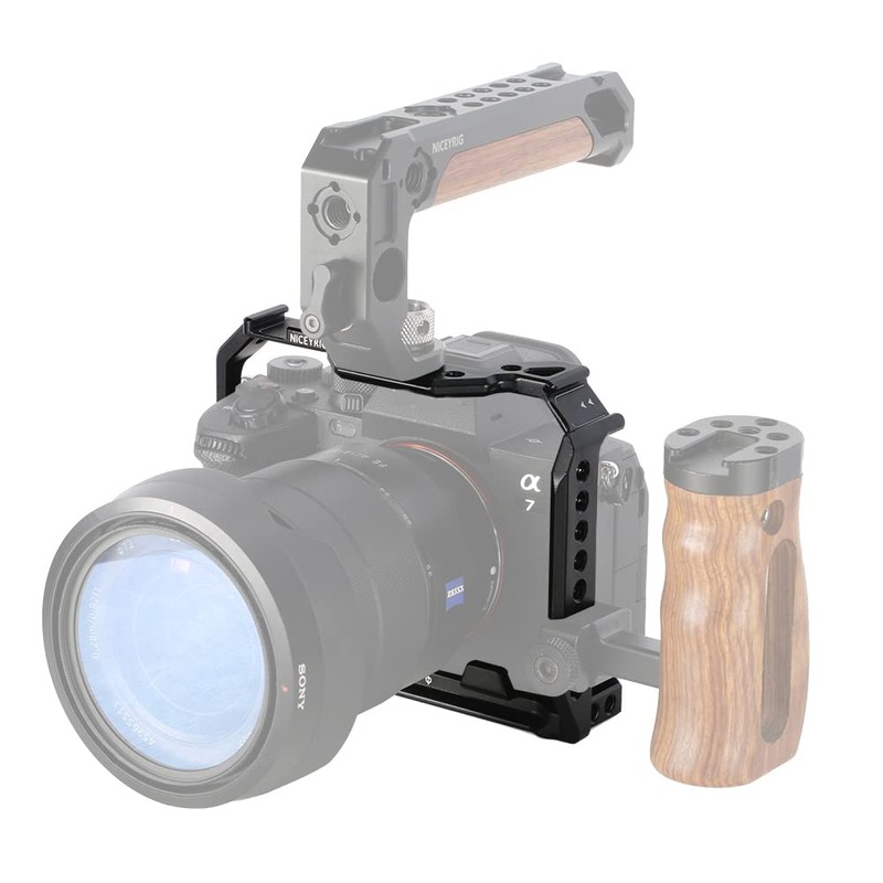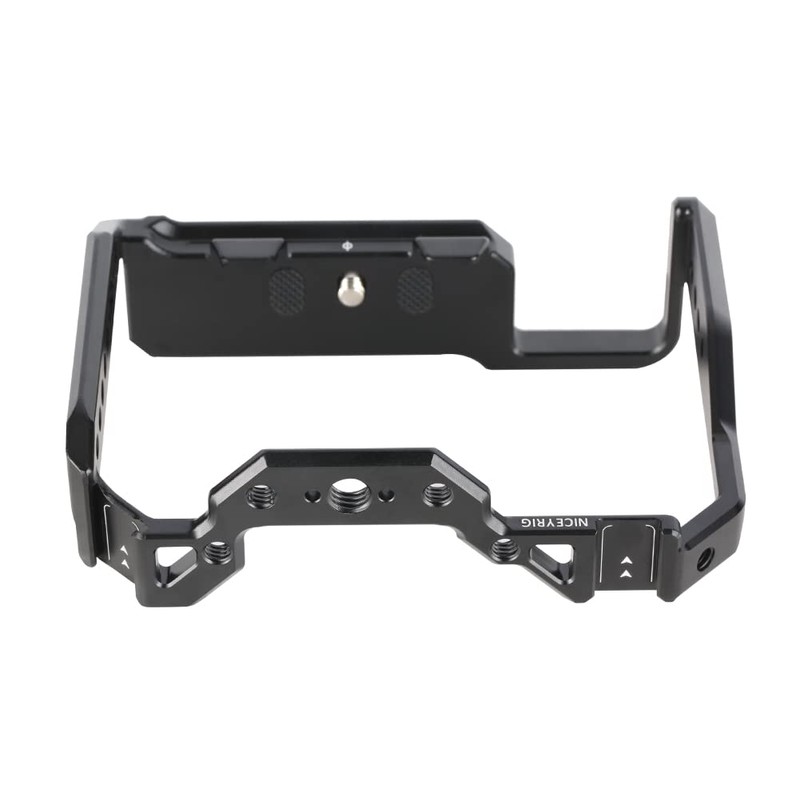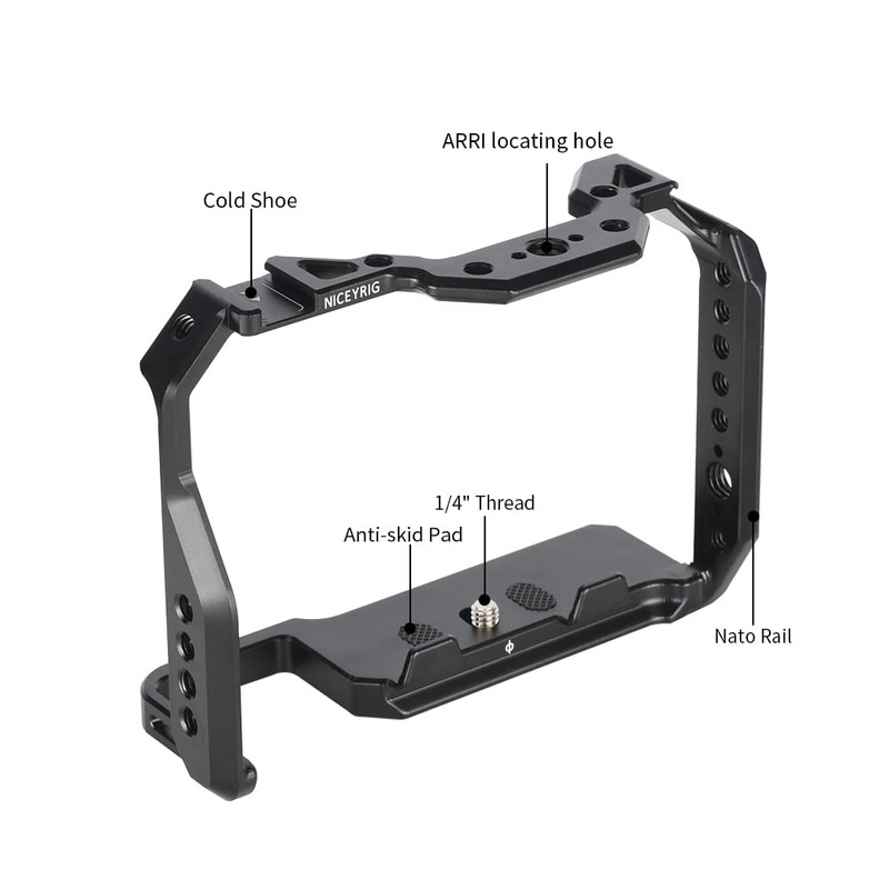 - [Many Cage Functions] The top of the camera cage is made with a NATO rail so it can be used with Niceyrig top handles 393/450/452. This nut rail allows you to connect handles and other equipment to NATO specs. Luxury 1/4" and 3/8" screw holes around the camera cage, especially the left side screw hole allows you to freely connect the peripheral pads. Also, the hand belt hole on the right side, so you don't have to worry about the camera falling off after installing the belt