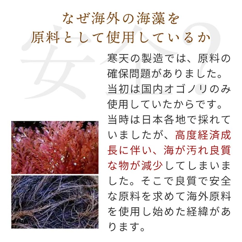 紅藻類、特にテングサ・オゴノリが使われています。南米や地中海沿岸などから海藻が輸入され、長野県伊那市にて粉寒天が作られています。