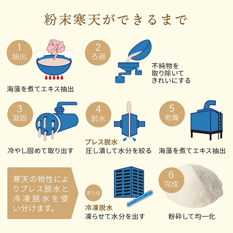 - ※本製品は高級グレードです。 寒天の里 長野県 伊那製造の粉寒天100%使用。寒天のほとんどが食物繊維で、あらゆる食品の中でもトップクラス。食物繊維はたんぱく質、糖質、脂質、ビタミン、ミネラルに続く第6の栄養素とも呼ばれています。