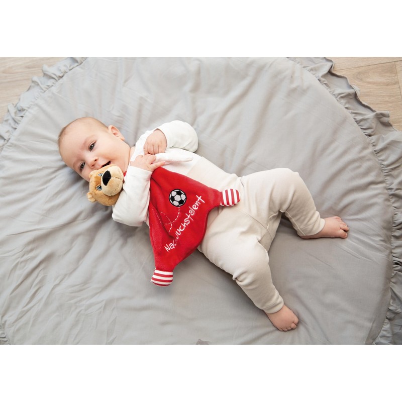 - Sporty cuddly bear: with its long, fluffy sleeves, the cute baby toy invites you to grab and cuddle - with the print "Nachwuchstalent" perfect for all little football fans