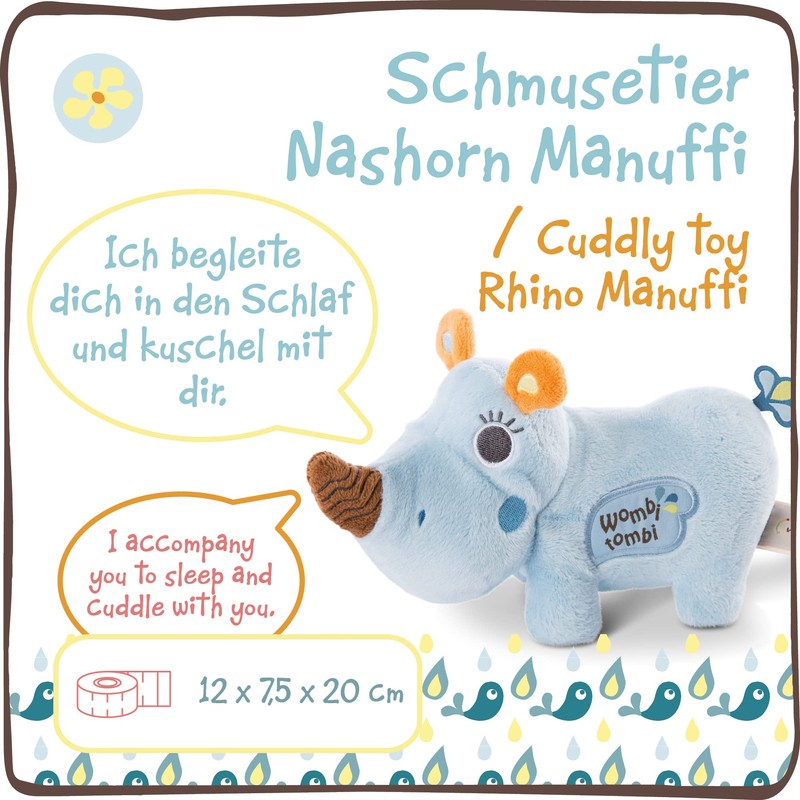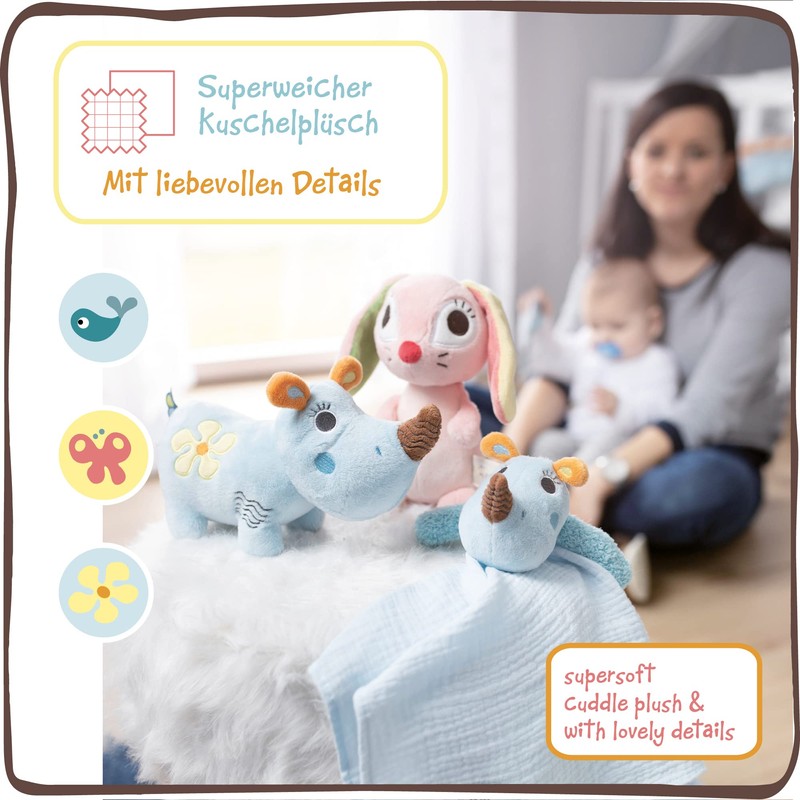 - Gifts for birth and christening: the baby cuddly toy is a beautiful baby gift. The bright colours and cute embroidery make Rhino Manuffi a real eye-catcher