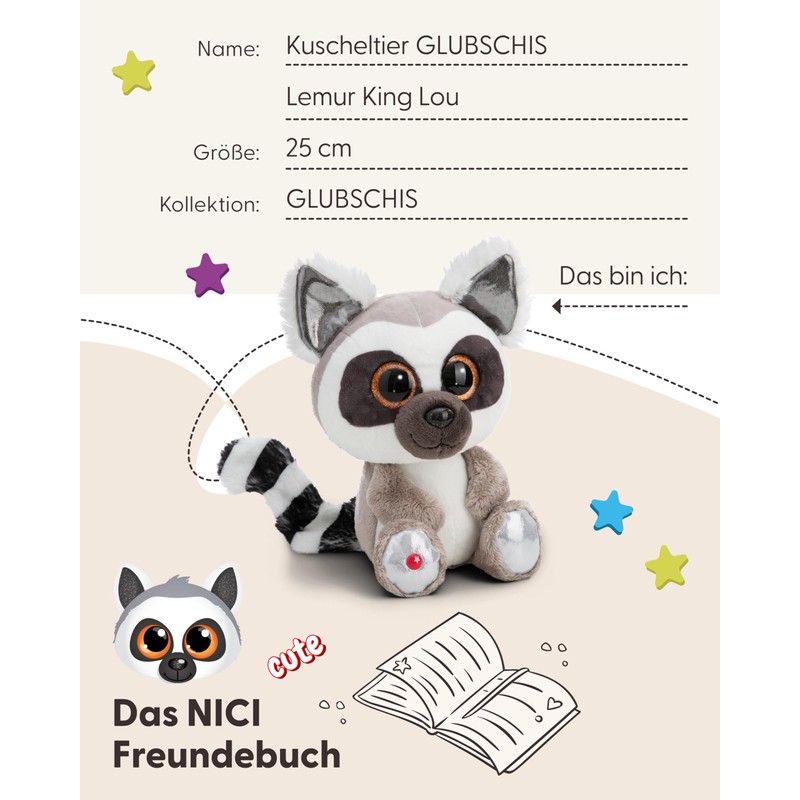 - GLUBSCHIS: Lemur cuddly toy King Lou comes from Madagascar directly into your home. As a fluffy plush friend, it impresses with its glitter eyes, the long, curled tail and silvery shiny inner ears