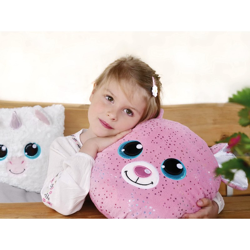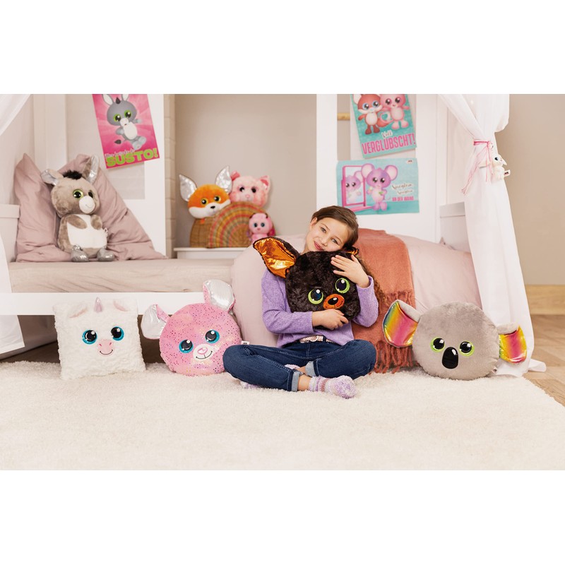• Glubschis cushion – The plush cushion Glubschis Mouse Miss Mausie in the shape of a mouse head is not only fluffy soft, but impresses with an enchanting facial expression, large, blue glitter eyes, a pink shiny nose and silvery-shimmering ears; the cushion made of pink NICI plush is decorated over and over with colourful stars made of glitter material