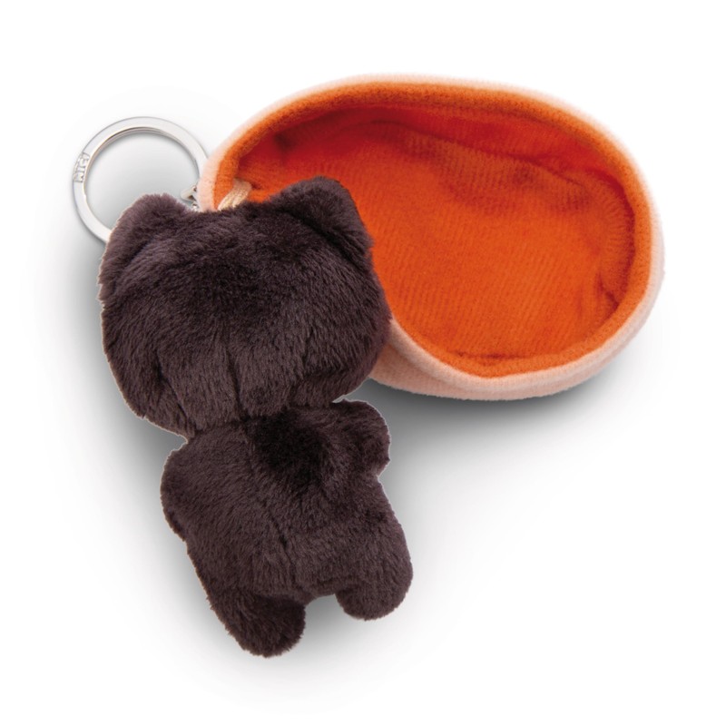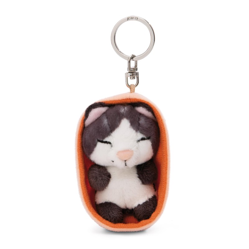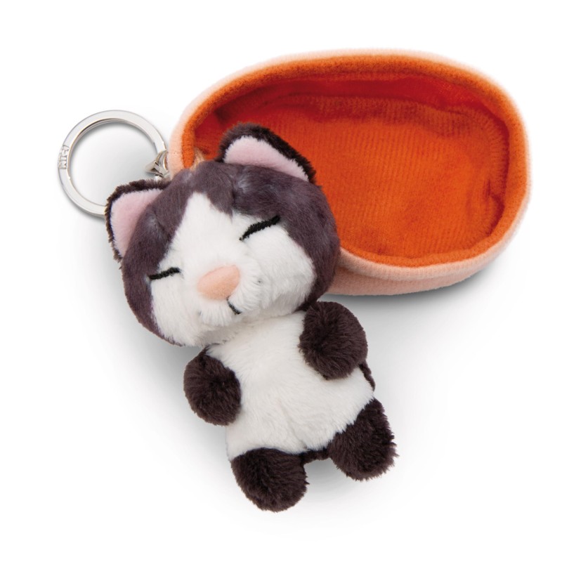 - Keyring - Meow! The black cat with an extremely cute face and elaborately embroidered sleeping eyes has made it cosy in its peach-coloured plush basket; the sleeping kitten made of soft Nici plush can be attached as an 8 cm large key ring thanks to a sturdy metal key ring on the keychain, backpack, school bag etc. A magical gift for small and large plush fans