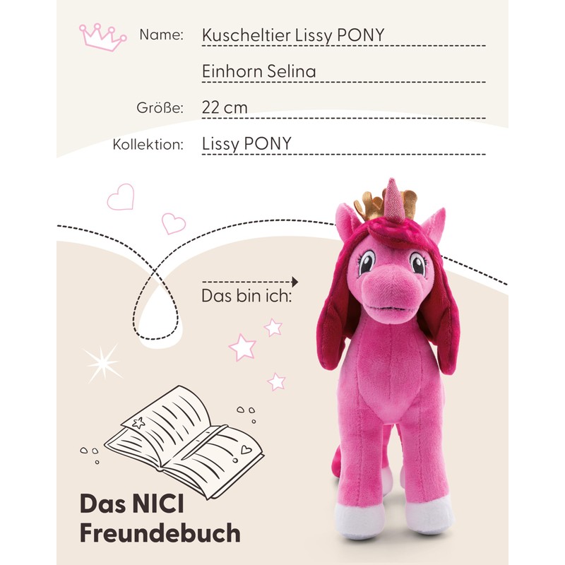 - Selina is the majestic crown unicorn from the magical world of Lissy Pony unicorns. The cuddly toy unicorn enchants little Lissy Pony fans with golden crown and the fluffy Nici plush in pink