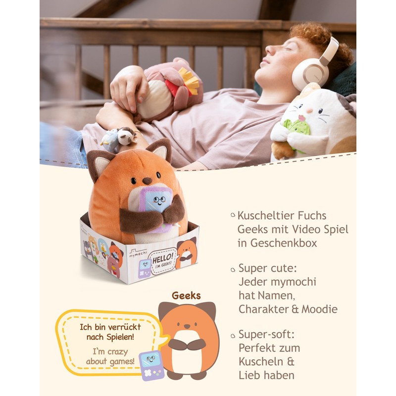 • MYMOCHI GEEKS Hello, I'm geeks and crazy about games! The cuddly toy fox made of fluffy Nici plush has a super soft filling. He brings a video game as a moodie - his favourite friend