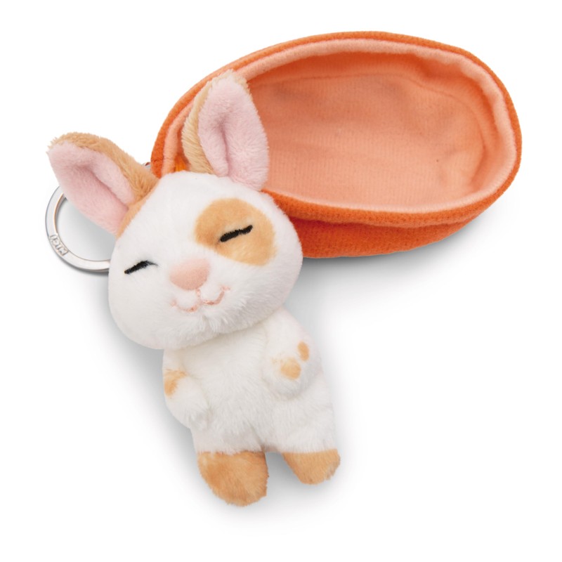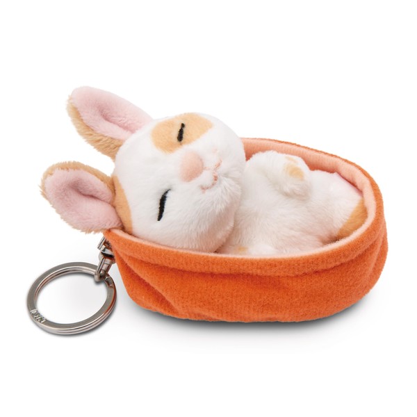 - Key chain – how cute! The beige bunny with elaborately embroidered sleeping eyes, long rabbit ears and an extremely cute face has snuggled up comfortably in its peach-coloured plush basket; the sleeping bunny made of soft NICI plush can be attached to the keychain, backpack, school bag etc. as an 8 cm large key ring thanks to a sturdy metal key ring, backpack, school bag etc. A magical gift for small and large plush fans