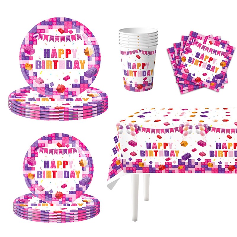 Nicime Building Block Birthday Supplies, Pink Cute Happy Birthday Tableware for Kid, Party Decoration Supplies with Tablecloth, Plate, Paper Cup, Napkin