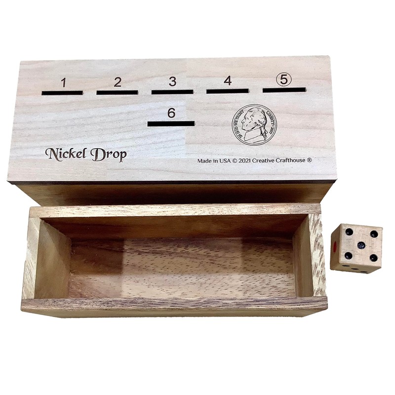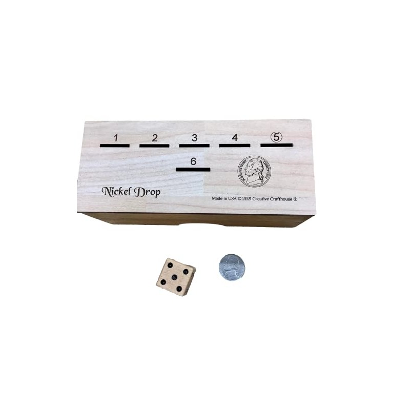 Nickel Drop – fun family or bar game Many of you may be familiar with Penny Drop, one of our trademark and most popular items. We now extend the fun with Nickel Drop, a similar game with a slight variation to provide a bit more risk and strategy and probably some name-calling…. Be the first to get rid of all your nickels. The all wood box measuring 6 x 2.5 x 2.6” is topped with a floorboard playing surface to provide both scratch and water resistance. Text is all deeply laser engraved. Includes one of our handmade and 7/8" dice. Made in our Hudson Florida shop, copyright Creative Crafthouse RULES: For 2 or more players EACH PLAYER NEEDS 12 nickels : note - you can use 10 or 11 nickels if you want to make a faster game THE OBJECT OF THE GAME IS TO BE THE FIRST TO GET RID OF ALL OF YOUR NICKELS. 1. Determine who goes first by each player rolling the single dice cube. Highest # goes first; then play proceeds in a clockwise direction. 2. Player rolls the die and must put a nickel in the game board slot corresponding to the number shown on the die. 3. If the player rolls a number that already has a nickel in it, they must take all of the nickels showing on the board and then the turn goes to the next player. The EXCEPTION to this is if a 5 is rolled and there is already a nickel in the 5 slot. In this case, the player still loses his turn but first takes the nickel from the 5 slot and gives it to any player of his choice. (this is where the name calling comes into play…) 4. A player must take at least one roll, but can take as many rolls as they want until they get stuck as in rule #3. 5. Hole number 6 lets the nickel falls inside the box so you can roll as many as 6’s as possible without penalty 6. Play continues until a player runs out of nickels and is declared the winner. The nickels are redistributed to start the next game.