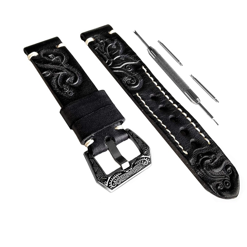 • You will receive 1 (one) a High Quality Embossed Leather Watch Band (2x Pins 1x Buckle and 1x Tool - included). Easy to Attach with the Included Pins and Tool.