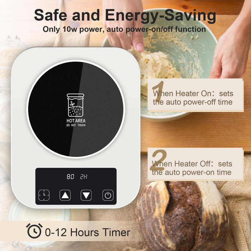 - [0-12H Timer Auto Off]: The sour dough starter heater with only 10W of power, but could warming rapidly. With the heater on, pressing the time button sets the auto power-off time, with the heater off, pressing the time button sets the auto power-on time. 0-12H timer set, intuitive color light (red or blue) allows you to clearly understand the status of the heater. A really safe and energy-saving starter warmer for daily use