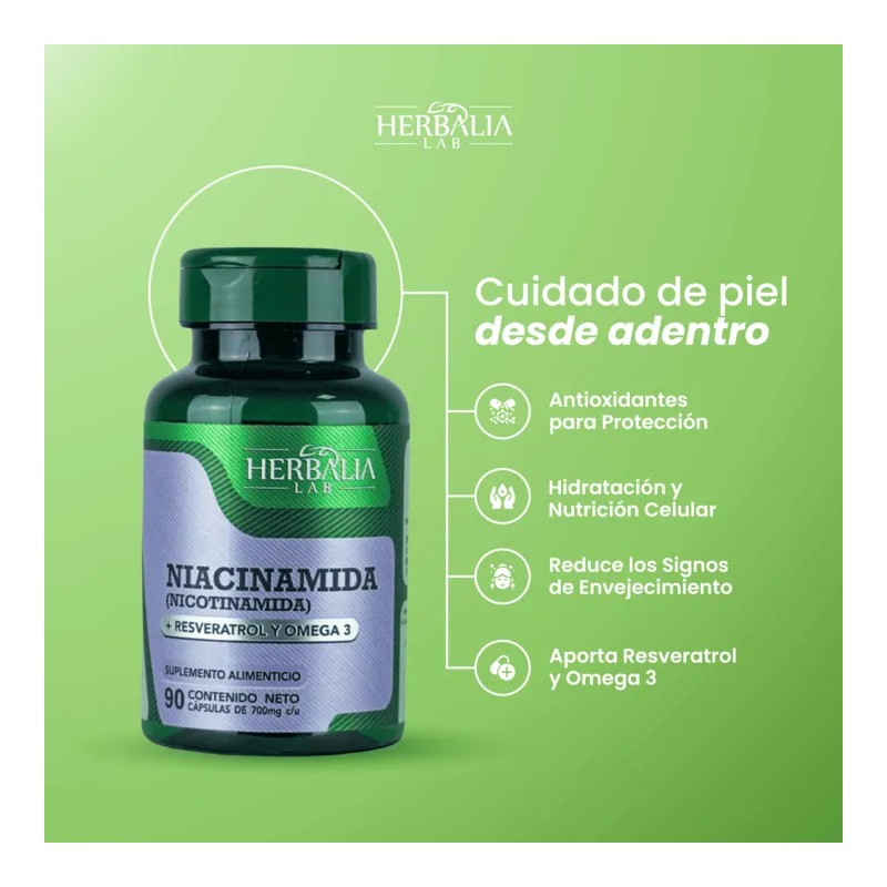 Nicotinamida en Cpsulas Beneficios para la Piel Apoyo Antioxidante 90 Cpsulas 700mg Herbalia Lab Niacinamida Resveratrol Omega 3