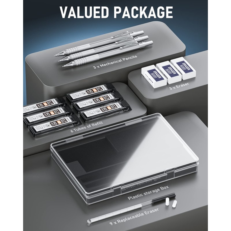 - Package contains: 3 pcs of 0.7 mm mechanical pencils with 6 tube of HB pencil lead, 3 pcs 4B-soft erasers, 9 pcs mini cap eraser refills in a storage case