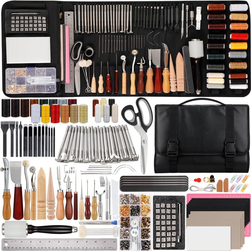 - LARGER LEATHER TOOLS STORAGE BAG: The leather tooling kit contains 160 pcs leather working tools, and all of the leather craft tools are well-organized in custom storage handbag (XXXL size: 33.5x14.6 inch) with waterproof and durable PU leather outer layer, expandable and portable, which is easy to carry out, no need to warry about losing tools