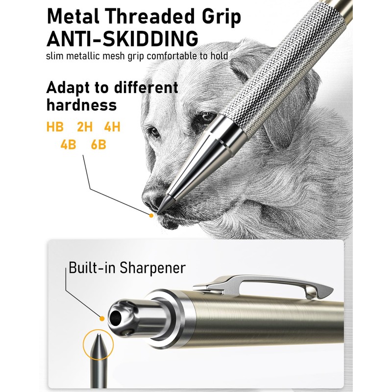 - 2 PCS 2mm Lead Holder: Metal Threaded Anti-skidding pen tube, feature a lead sharpener design, allowing you to sharpen the pencil lead at any time.The 2.0mm graphite leads are available in 6B 4B 2B HB 2H 4H and colors, perfect for sketching in different shades and drawing skill