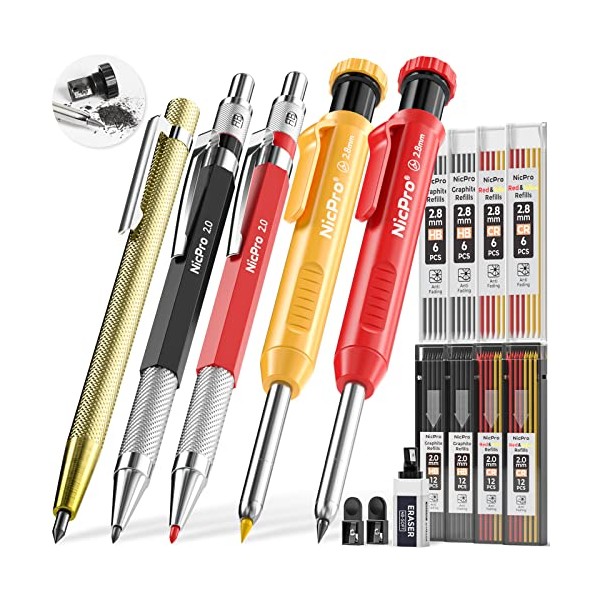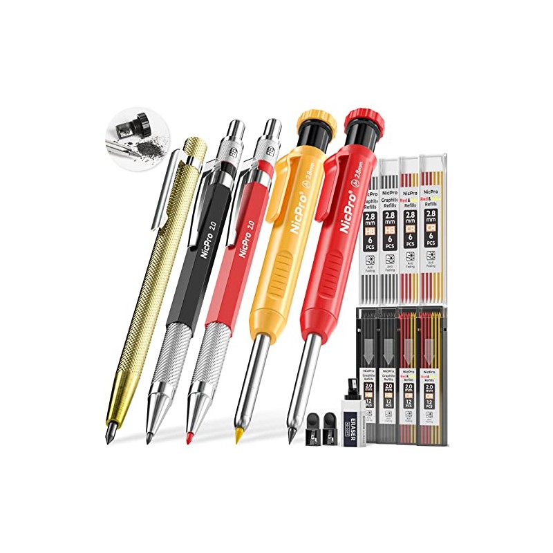 - 【Carpenter Marking Tools Set】: This mechanical carpenter pencils set include 2 pcs 2.8 mm solid mechanical carpenter pencil with 24 refills, 2 pcs 2.0mm mechanical pencils with 48 refills, 1 engraving pen, 1 eraser, 1 sharpener for 2.8 mm pencil and 2 sharpeners for 2.0 mm pencil.