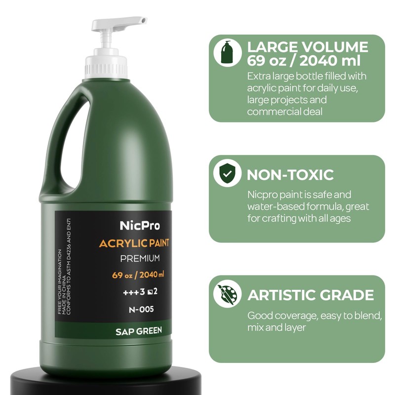 Nicpro Sap Green Large Acrylic Paint Set (69 oz, 2040 ml) Rich Art Painting Supplies Non Toxic for Multi Surface, Canvas, Wood, Leather, Fabric Stone Craft, for Kids & Adults with Pump
