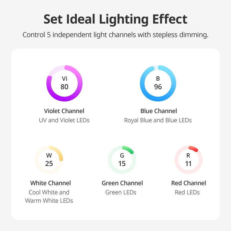 - Control 5 independent light channels with stepless dimming from 0% to 100% (For HyperReef Gen 2 Only)