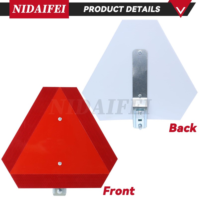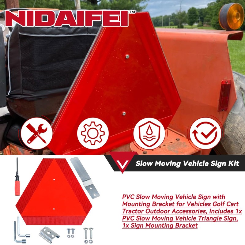 - Includes: 1x PVC Slow Moving Vehicle Triangle Sign+1x Sign Mounting Bracket+1x Assembly Tool Kit(1x L-shaped 11mm Socket Wrench+1x L-shaped 13mm Socket Wrench+1x 2 inch Phillips Screwdriver)