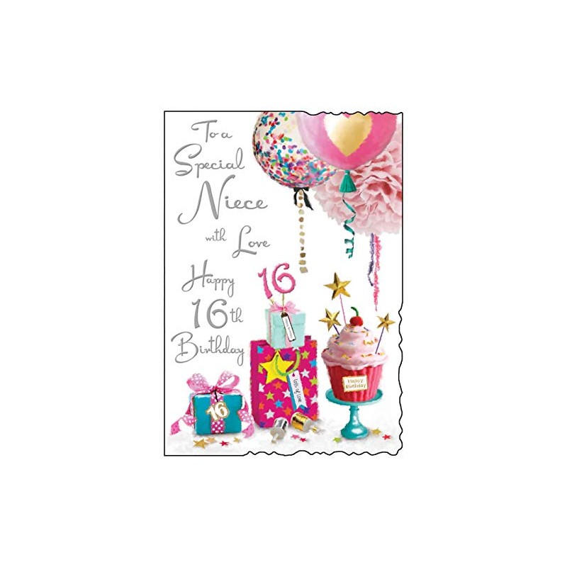 - Jonny Javelin Niece 16th Birthday Card & Envelope - Cupcake, Balloons and Gifts with Glitter and Embossed Silver Foil